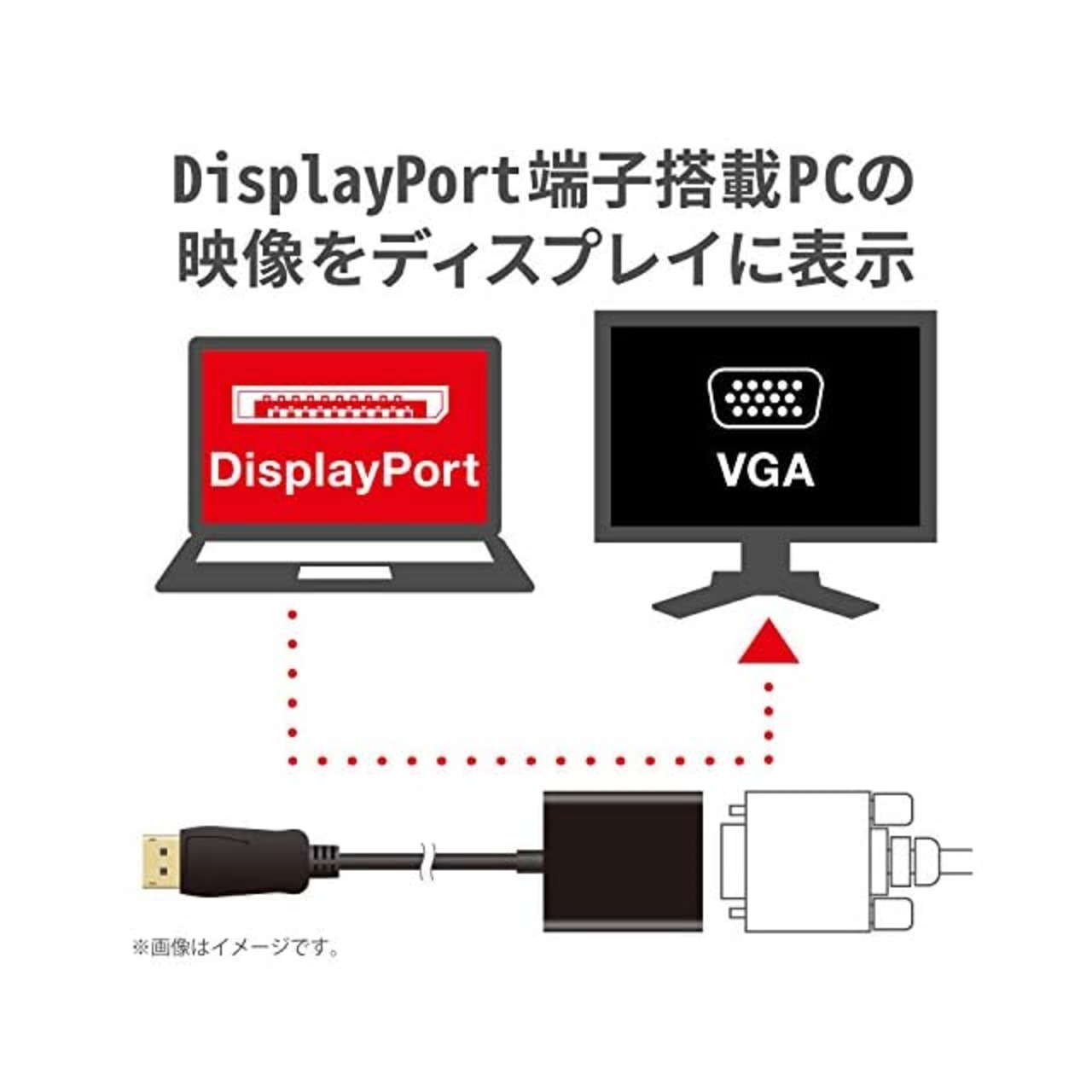 VGA(D-sub15pin)入力端子搭載のディスプレイに映像を出力できる。 DisplayPort端子を搭載したパソコンの映像信号を変換し、VGA(D-sub15pin)入力端子を搭載したディスプレイなどに出力することができる変換アダプタ。
