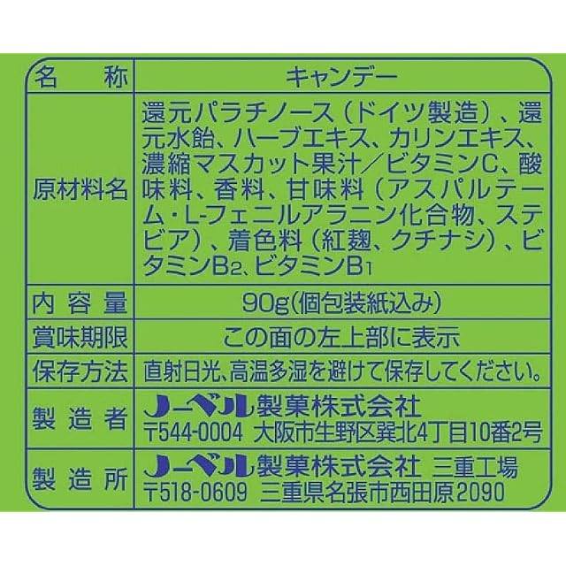 原材料:還元パラチノース、還元水飴、ハーブエキス、カリンエキス、濃縮マスカット果汁、ビタミンC、酸味料、香料、甘味料(アスパルテーム・L-フェニルアラニン化合物、ステビア)、着色料(紅麹、クチナシ)、ビタミンB2、ビタミンB1