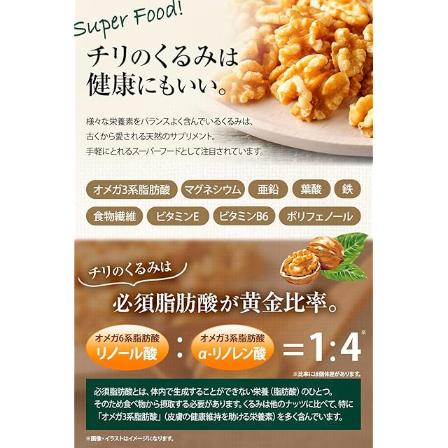 ?【栄養機能食品(n-3系脂肪酸)】n-3系脂肪酸は皮膚の健康維持を助ける栄養素です。必須脂肪酸は体内で生成することができない栄養の一つで食べ物から摂取する必要があります。食物繊維・鉄・葉酸・ビタミンE・亜鉛・マグネシウムなど様々な栄養素をバランスよく含んでいるくるみは、古くから愛されるスーパーフードとして注目されています。オメガ3系脂肪酸を含んでいます。