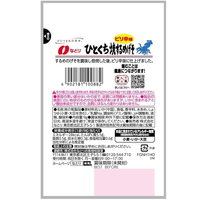 原材料:いか(中国)、食塩、香辛料、水あめ、しょうゆ(小麦・大豆を含む)/乳酸Na、調味料(アミノ酸等)、pH調整剤、酒精、酸味料