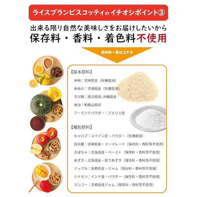 ライスブランビスコッティ の紹介 九州は宮崎県高千穂町の廃校となった給食室を使って製造しています。 有機無農薬栽培で育てた米粉(ヒノヒカリ、ミズホノチカラ)と米ぬか、キビ砂糖に野菜や果物を生地に混ぜ込んで焼き上げたグルテンフリーの無添加お菓子ビスコッティです。 オーガニックの焼き菓子なので、ビーガンの方でも気にせずに召し上がっていただけるしっかり噛むヴィーガンスイーツです。 ビスコッティという響きにはあまり馴染みがないかもしれませんが、クッキーやサブレ、ビスケット、ラスク、スコーン、せんべい、米粉クッキー、オーガニックお菓子等と同じスイーツ・焼き菓子の仲間です。 こちらの商品の一番の特徴は焼き菓子にはかかせない卵や牛乳などのアレルギーのある食材をほとんど使用しておりません。いわゆる7品目不使用となっております(アレルギー対応)。動物成分不使用の硬めのおやつです。 中身は4種類が食べ比べできる自然派堅焼きのお試しセットです。 動物成分不使用で硬めのおやつです。