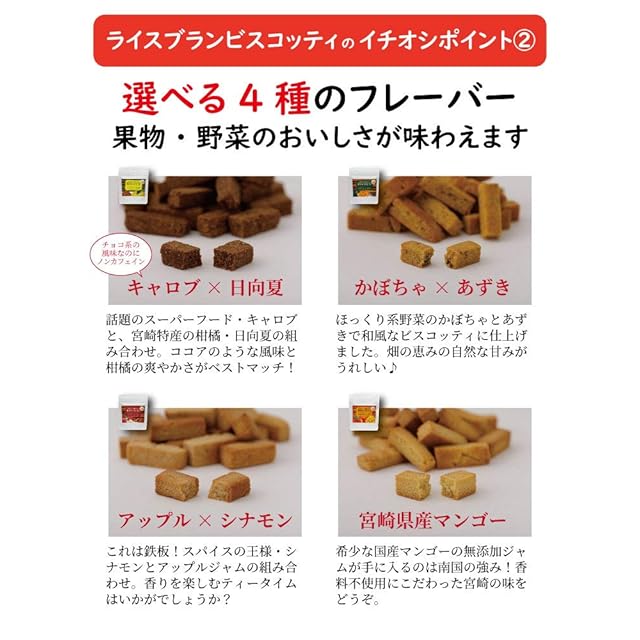 〇アップル×シナモン 一番人気のりんごが果肉ごと入ったビスコ。シナモンが良いアクセントです。 〇かぼちゃ×あずき 北海道産のかぼちゃとあずきを使用した一品。店長のイチオシです! 〇キャロブ×日向夏 キャロブはカカオの代替品でカフェインを含んでいないんです。 日向夏は宮崎県名産の柑橘のハーモニーをお楽しみください。 〇マンゴー 言わずと知れた宮崎県の特産品!果肉が入ったマンゴージャムをた?っぷり使用しております。
