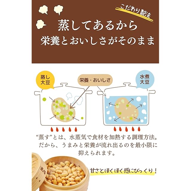 ?【しっかりとした食感】蒸したことによりまめにホクホクとした食感が生まれ、噛みごたえがプラスされました。お弁当に加えても崩れにくく、噛むたびに広がる小豆の芳醇な風味が料理を引き立てます。一般的なまめ製品よりも甘みがあるので煮物やサラダにもぴったり!料理の楽しみが増える一品です。