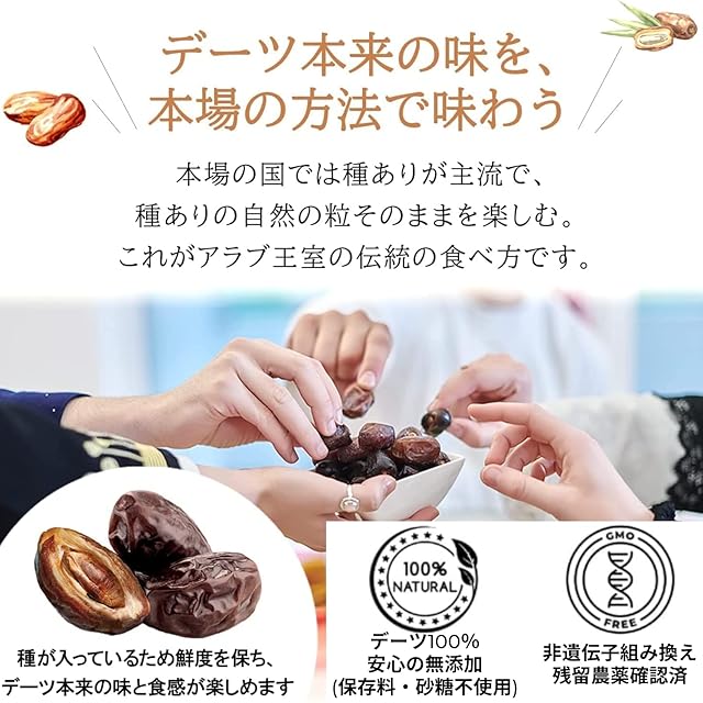 【本来のデーツの味を楽しむ】デーツクラウンのデーツは、種入りです。種抜きは実をカットするため少し硬い食感ですが、デーツクラウンは種入りのためデーツ本来の柔らかさを味わうことができます。本場のデーツを本場の食べ方で、それがデーツクラウンのこだわりです。無添加、砂糖不使用、オイル不使用、非遺伝子組換え、残留農薬検査済(日本)のデーツです。