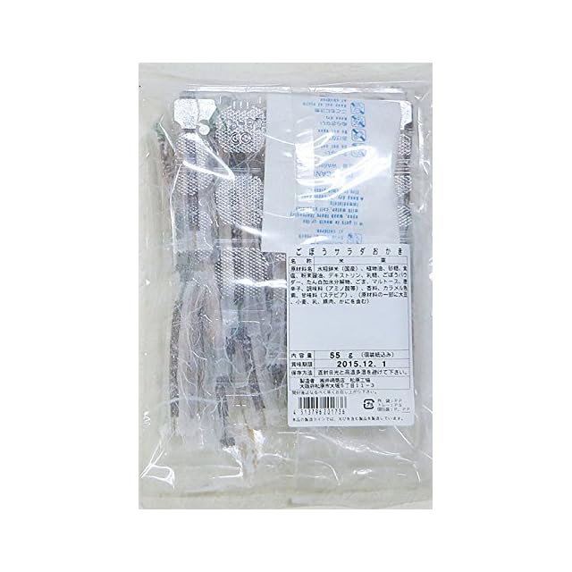 原材料:水稲餅米(国産)、植物油、砂糖、食塩、粉末醤油、デキストリン、乳糖、ごぼうパウダー、たん白加水分解物、ごま、マルトース、唐辛子、調味料(アミノ酸等)、香料、カラメル色素、甘味料(ステビア)、(原材料の一部に、大豆、小麦、乳、豚、かにを含む)