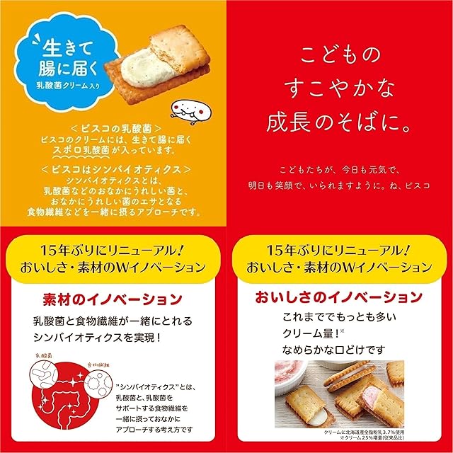 生きて腸に届く乳酸菌クリーム入り ・やさしい甘みのミルククリームと、甘酸っぱい完熟いちごのクリームを、サクッとしたミルクビスケットでサンドしました ・バターミルク入りのクリームと、やさしい甘さのカフェオレクリームを、 サクッとしたバタービスケットでサンドしました なめらかな口どけで、家族みんなで楽しんでいただける乳酸菌クリームサンドです 2枚入り個包装なので、少しだけ食べたいときや、夫婦や少人数の友人同士で分け合いたいときなど、様々なシーンでお楽しみいただけます <ミルク小麦粉(国内製造)、砂糖、ショートニング、乳糖、植物油脂、全粉乳、イヌリン、食塩、でん粉、小麦たんぱく、乳酸菌/炭酸Ca、膨脹剤、香料、乳化剤、調味料(アミノ酸)、V.B1、V.B2、V.D、(一部に乳成分・小麦を含む) <いちご小麦粉(国内製造)、砂糖、ショートニング、乳糖、小麦全粒粉、植物油脂、イヌリン、全粉乳、いちごパウダー、食塩、小麦たんぱく、でん粉、乳酸菌/炭酸Ca、膨脹剤、香料、乳化剤、調味料(アミノ酸)、酸味料、V.B1、V.B2、V.D、(一部に乳成分・小麦を含む) <バニラ小麦粉(国内製造)、砂糖、ショートニング、全粉乳、植物油脂、発酵バター、乳糖、イヌリン、食塩、バターミルクパウダー、小麦たんぱく、乳酸菌、バニラビーンズシード/炭酸Ca、膨脹剤、乳化剤、香料、調味料(アミノ酸)、V.B1、V.B2、V.D、(一部に乳成分・小麦を含む) <カフェオレ小麦粉(国内製造)、砂糖、ショートニング、乳糖、植物油脂、発酵バター、全粉乳、イヌリン、食塩、ココアパウダー、小麦たんぱく、でん粉、乳酸菌、コーヒーパウダー/炭酸Ca、膨脹剤、乳化剤、香料、調味料(アミノ酸)、V.B1、V.B2、V.D、(一部に乳成分・小麦を含む)