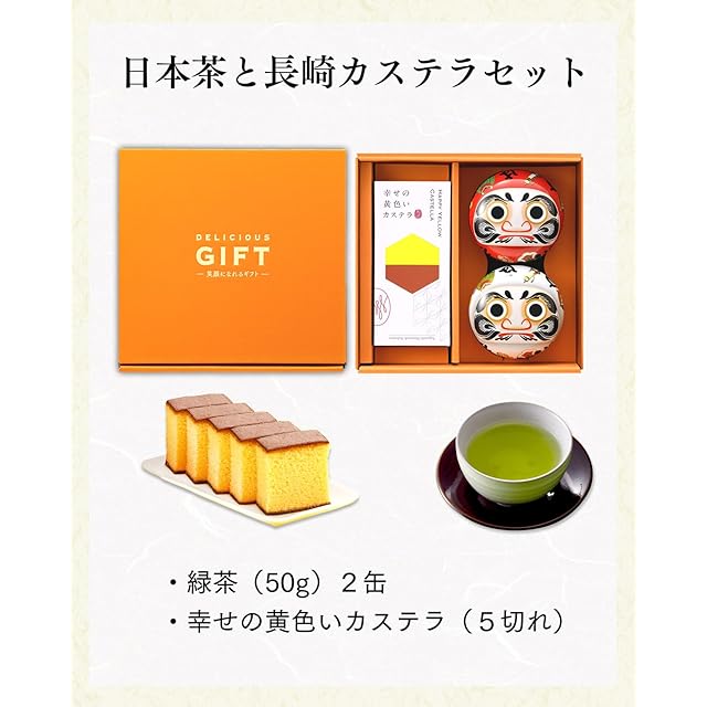 【商品特徴】日本茶(50g)×2缶 / 幸せの黄色いカステラ1本(5切れカット済み)/1本の外寸:約15.0x6.7x6.5cm/1本の内容量:155g/パッケージ:ギフト専用。/防腐剤不使用で安心してお召し上がりいただけます。/直射日光、高温多湿を避けて保存してください。