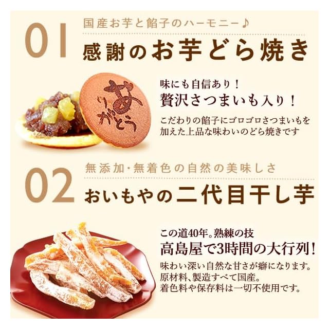 【原材料】○二代目干し芋 …さつまいも(国産)○お芋どら焼き…芋入り餡(砂糖、小豆、さつまいもかのこ、還元水飴、水あめ、寒天、食塩)(国内製造)、卵、小麦粉、砂糖、黒糖、植物油脂、はちみつ、水あめ、みりん、麦芽糖、寒天/トレハロース、クロレラ抽出液、膨張剤、乳化剤、香料、(一部に小麦・卵を含む) ※はちみつを使用しておりますので、1歳未満の乳児には与えないでください。