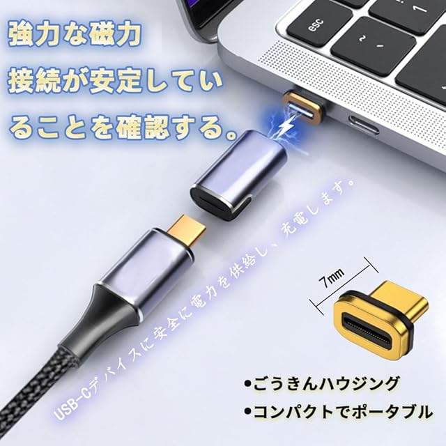 【磁気自動吸着機能】高耐摩耗性と耐熱性を持つ高品質なアルミニウム合金シェルと強力なN52磁石端子の組み合わせにより、自動的に吸着される磁気接続を実現。端子は防塵プラグとしても使用可能で、引っ張りや挿入による摩耗や損傷からしっかり保護。