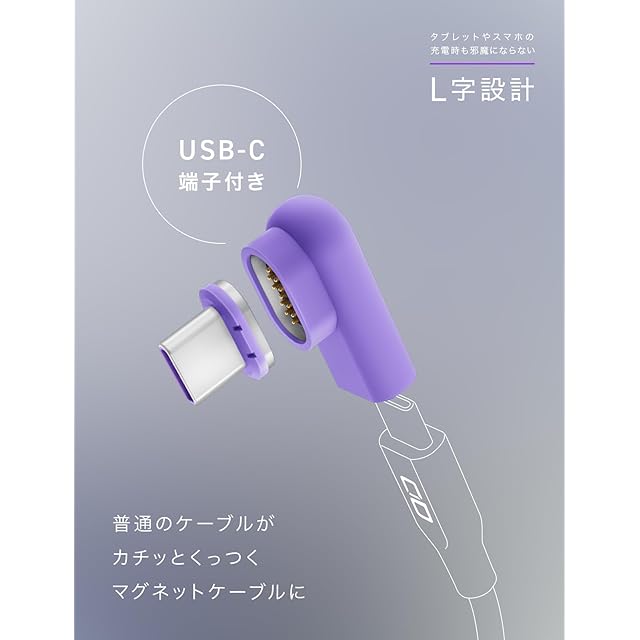 【ストレートタイプを便利なL字コネクタに】一般的なストレートタイプのUSB タイプCケーブルがL字コネクタのマグネットケーブルに!L字コネクタはスマホゲームや動画視聴、ノートパソコンの充電時にケーブルの取り回しが向上し、省スペース化にも便利です。※本製品はL字形状であるため、垂直方向に過度な力で取り外しするとコネクタが破損する可能性がございます。取り外しの際は水平方向に力を入れ取り外していただくようお願いします。