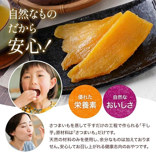【注意事項】必ずお読みください。 ●干し芋は食品添加物を使用していないため、写真イメージよりも黒く濃い色味の商品もございますので、予めご了承の程宜しくお願い致します。(写真はあくまでイメージとなります。) ●ほしいもの表面に白粉(しろこ)が吹く事がありますが、ほしいもの中の糖分が表面に出て来たもので品質に問題はございません。この商品はさつまいもを蒸かして、干しただけの加工品ですので、原料の成分や気温、加工時期により硬さ・糖度・色の違いが生じます。 また表面に繊維や黒ずみ、いもの皮由来による黒い斑点が見られることがありますが品質に問題ありません。 ●硬いほしいもはトースターや電子レンジ等で温めて頂くと、柔らかくなりお召し上がりやすくなります。(温め過ぎると焦げてしまいますので、ご注意ください。) ●商品の特性上ほしいもは並べずに袋に詰めますので、ほしいも同士がくっついてはがれにくい場合がございます。 ●歯科治療材がとれる場合がありますので、ご注意ください。 ●商品の包装は出来ません。 ●商品規格やパッケージのデザインは予告なく変更となる場合がございます。 ●環境に配慮し、商品には納品伝票及び明細書等はお付けしておりません。 ●当サイト内の文章・画像等の内容の無断転載及び複製等の行為はご遠慮ください。