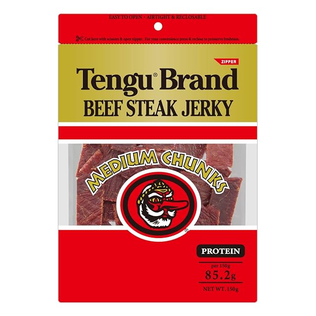 厳選された牛もも肉を使用し、醤油をベースとした味付けのビーフステーキジャーキーです。