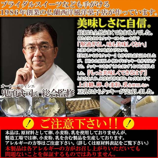 ✅【4つのゼロ】卵、小麦粉、乳、上白糖この4つの原材料、すべて…一切不使用!おからと豆乳でサクッとした程よい食感をお楽しみいただけます。