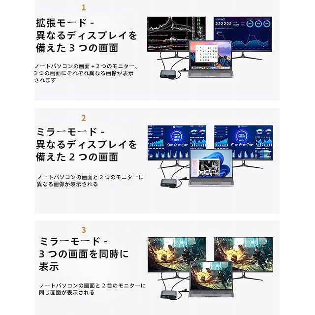 さまざまなシーンに対応:USB 3.0ポート、USB C充電ポートを搭載しておりこれは、オンライン教育、データ分析、ホーム オフィスに必須のアクセサリであり、Web および生産性ソフトウェアに最適です。プラグアンドプレイで使用しやすく、ゲーム、映画鑑賞、会議、勤務、授業、展覧会など、様々なシーンで活用できます。 複数のアダプターを使用せずに、会議中に異なるプロジェクターを簡単に切り替えることができます。 ゲーム、グラフィックスを多用する作業、またはデザイン作業には推奨されません。 【Netfl-ix、Hu-lu、You-Tube などのサイトでの HDCP で保護されたコンテンツの再生はサポートされていません。】