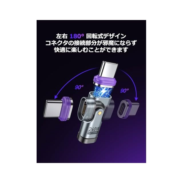 【16Pin・L字型・180°回転式デザイン】USB-C マグネット 変換アダプタが「左右180°調整」のデザインを採用し、充電の角度は「L字型」などを自由に調整できます。充電しながらゲームをしたり、動画を見たりする際、コネクタの接続部分が邪魔にならず、快適に楽しむことができます。