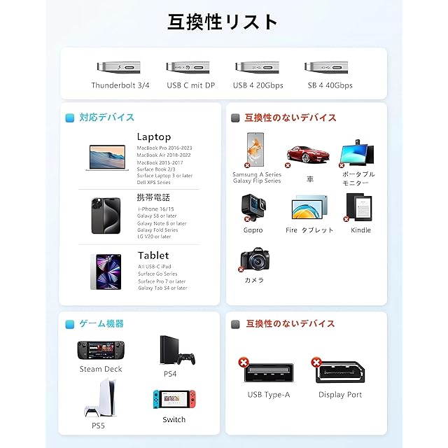 【幅広い互換性・i-/Phone15/16にも対応!】USB-C hdmi 変換アダプタ は USB-Cポートを装備したDPモードをサポートできるデバイスに対応できます。例えば:i-/Phone 15/15 Plus/15 Pro/15 Pro Max/ Phone 16, MacBok Pro/Air, Pad Pro/Air 5, Galaxy S24/S23/S23+/S23 Ultra/ S22/ S22+/S22 Ultra/S21/S20/Note 20/Note 10, Surf-ace Book 3/Laptop 5/Pro 7, Nintedo switchなど。-※全てのUSB-Cデバイスに対応できるのではないので、ご購入前にご確認ください。(ご注意:Sony Xperia、Xiao-mi 、Sharp -Aquosについて、ほとんど非対応機種となりますので、ぜひお先にお問い合わせください。)Sam-sung は DeXをオンにする必要があり、通常の携帯電話はテレビに接続するために USB デバッグをオンにする必要があります。