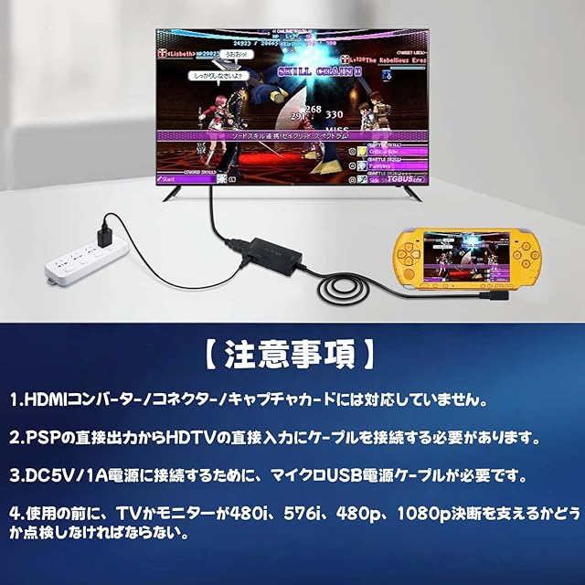 【ご注意すること】本製品を使用する前に、テレビまたはモニターが480i、576i、480p、1080pの解像度をサポートしているかどうかを確認する必要があります。ただし、一部の高解像度の4Kおよび8Kテレビまたはモニターでは、これらの解像度に対応していない場合があります。HDMIコンバータ/コネクタ/キャプチャカードはサポートしていません。 コンソールの直接出力から HDTV の直接入力にケーブルを接続する必要があります。 追加の DC 5V/1A 電源が必要です (別売り)。