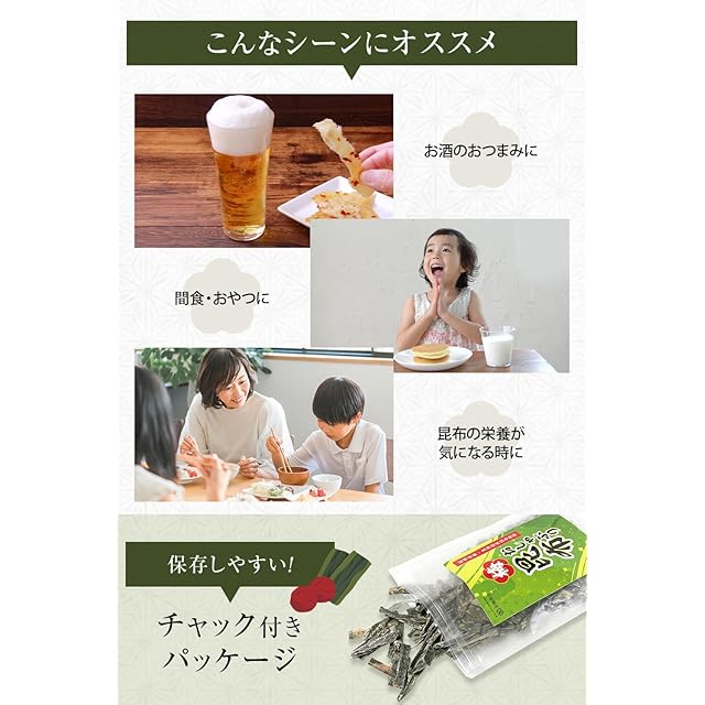 ✅【こんなシーンにオススメ】お茶漬けや梅昆布茶に。お酒のつまみに。間食・おやつに。昆布の栄養が気になる時に。保存に便利なチャック付きパッケージを使用。