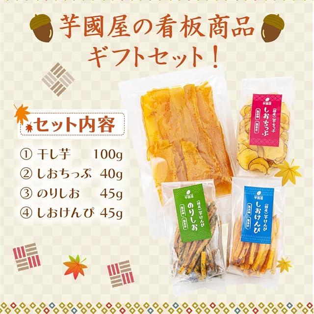 【セット内容】紅はるか干し芋100g、しおちっぷ40g、芋けんぴ(しおけんぴ)45g、芋けんぴ(のりしお)45g