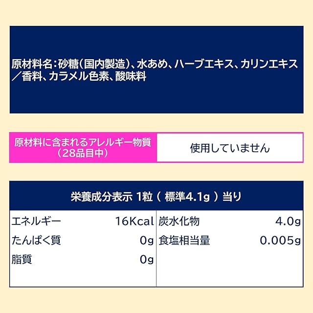 原材料:砂糖(国内製造)、水あめ、ハーブエキス、カリンエキス/香料、カラメル色素、酸味料