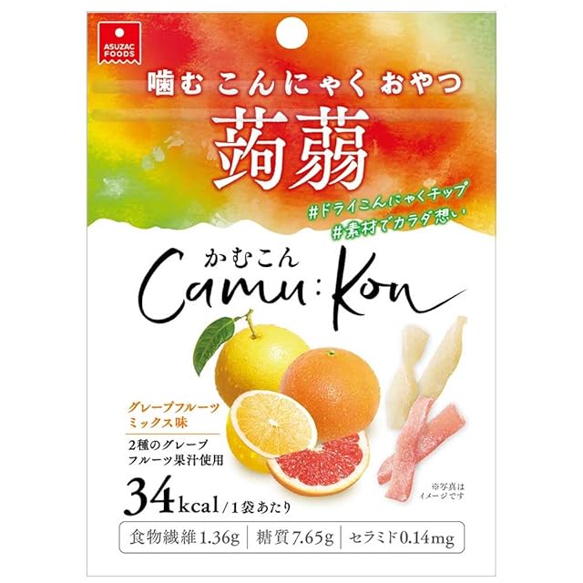 【グレープフルーツミックス味】ジューシーな甘みのレッドグレープフルーツ味と、ほろ苦さと酸味が特徴のグレープフルーツ味のこんにゃくチップを2種類ミックスしています。 まるでグミのようなむっちり弾力のある噛みごこちの食感に仕上げました。