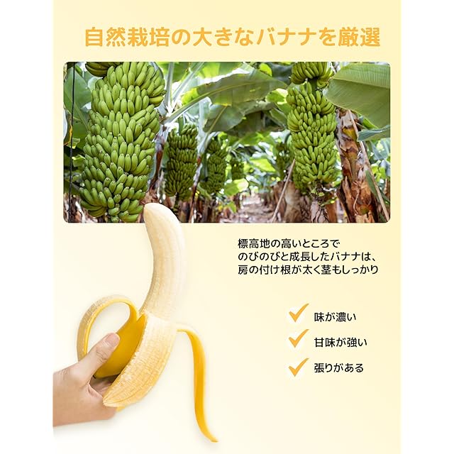 【材料選択/加工】①材料選択:中国産自然栽培の大きなバナナを厳選。標高地の高い所でのびのびと成長した、甘味の強いばななを使用しています。②GMP標準工場加工:深さ160メートルの水底に汚染のない井戸水を用いて洗浄し、−30℃で凍結乾燥、金属探査による不純物除去、オゾン滅菌、無菌職場での包装を行っています。