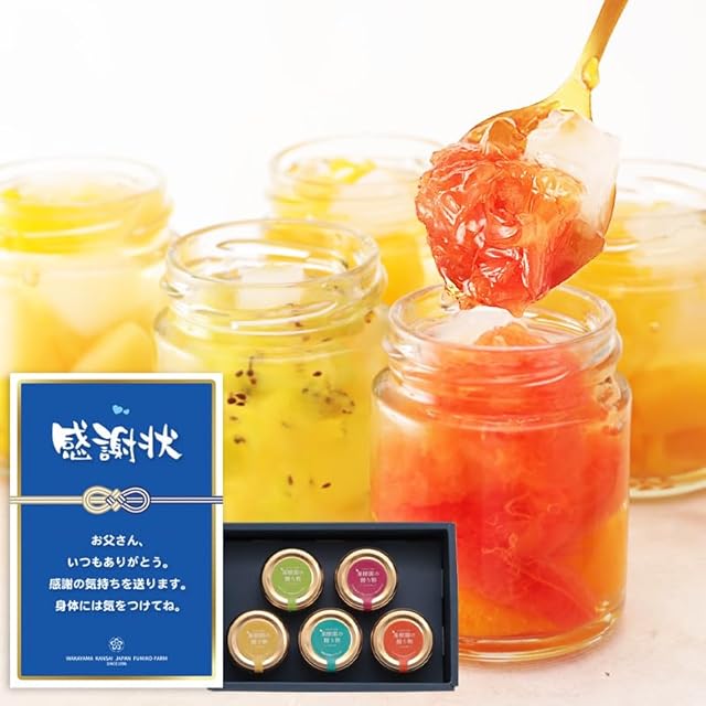 ガラス瓶入りの果実ゼリーセット。それぞれのフルーツの風味やお味から組み合わせを考え、食物繊維豊富なナタデココも一緒に瓶にそっと閉じ込めました。