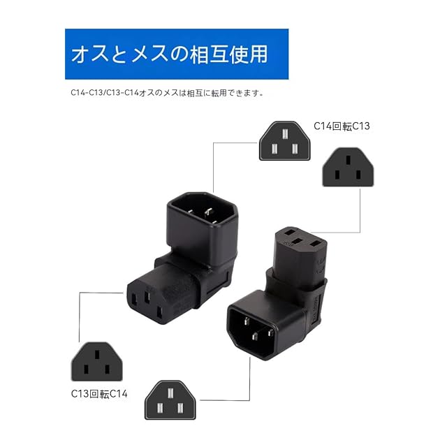 KUENZ 3ピン変換コネクタ L型上向き【電源ケーブルの取り回し、配線スペースの確保に! (定格:10A/250V) 3ピンメス(IEC 60320 C13)から3ピンオス(IEC 60320 C14)に変換します(2パック)