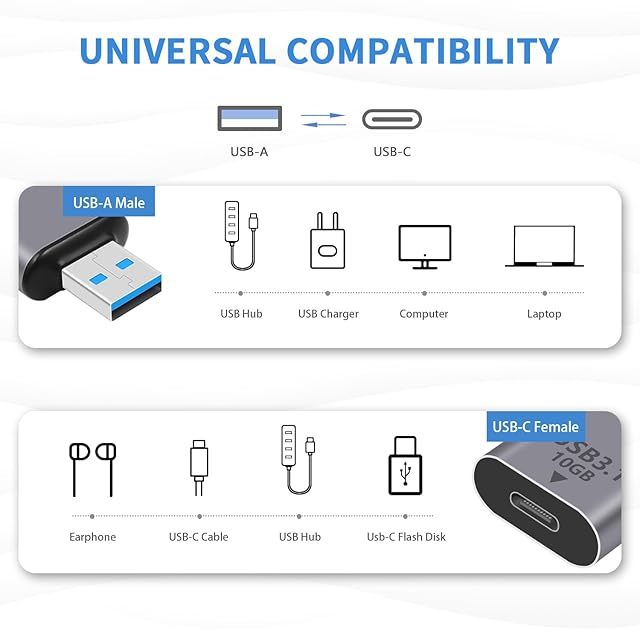 USB C to USB A 変換アダプタは、携帯電話、PC、充電器、カーチャージャーなどのタイプCデバイスをコンピュータのノートパソコンやUSB A壁/カーチャージャーに接続して同期や充電ができます。