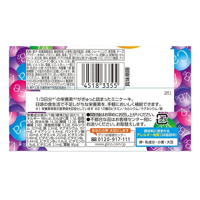 原材料: 小麦粉(国内製造)、砂糖、ショートニング、麦芽糖、チーズパウダー、水あめ、イヌリン、鶏卵、食塩/加工デンプン、ソルビトール、炭酸Ca、炭酸Mg、セルロース、乳化剤、香料、膨脹剤、パプリカ色素、酸化防止剤(チャ抽出物、V.E)、ピロリン酸鉄、ナイアシン、V.E、パントテン酸Ca、V.B1、V.B2、酸味料、V.A、V.B6、葉酸、V.D、V.B12、(一部に卵・乳成分・小麦・大豆を含む)