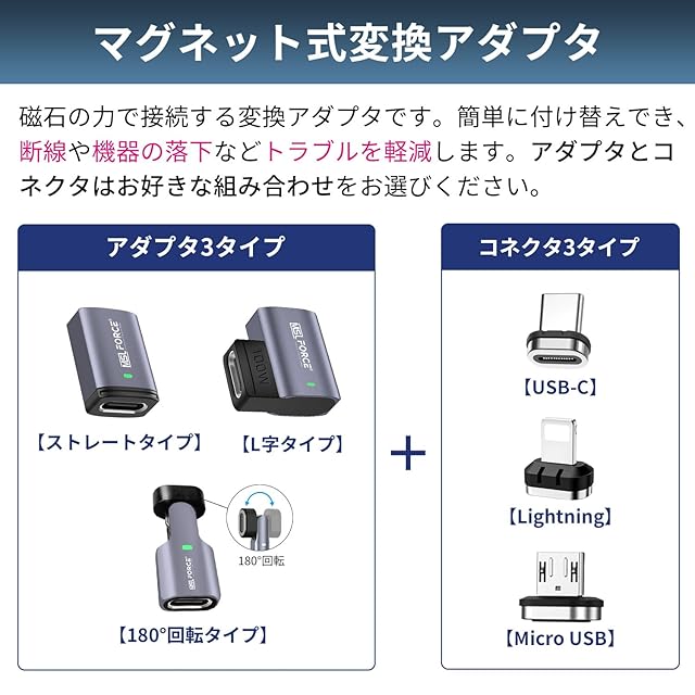 【マグネット式変換アダプタ】 磁気の力で接続できる変換アダプタです。断線や機器の落下等どらブルを軽減。耐摩耗性、耐熱性に優れた高品質アルミニウム合金シェルと強力な磁力を持つN52マグネット端子を組み合わせており、近づくと自動吸着で接続になり、端子が防塵プラグとしても使えて、デバイスポートへの引っ張りや繰り返しの抜き差しによる磨耗・損傷をしっかり防ぎます。アダプタ本体には接続が正常であることを示すLED表示ランプを搭載し、使用中に緑色点灯で表示されます。