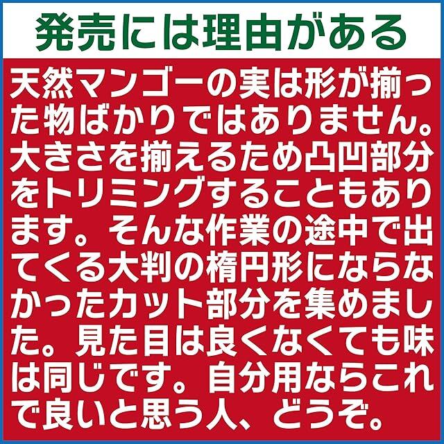 【ご注意ください】 材料に天然のマンゴーを使用しております。原材料の時点で色合いやサイズ並びに果肉の部位にばらつきがあります。当商品はそれらを無選別で袋詰めしております。薄い黄色から褐色、灰褐色までの材料が同一袋の中に梱包されていますのでご了承ください。 バナナやリンゴと同じようにマンゴーは時間経過と共に色が濃くなります。薄黄色の材料はあまり変化しませんが、濃い黄色からオレンジ色のものは濃厚なオレンジ色から茶褐色に変化します。変色後は色のばらつきが激しくなるので見た目の統一感がなくなります。色の変化による特別な品質の劣化はありません。 商品の中にはマンゴーの繊維や皮部分などが残っています。もちろん品質には全く問題はありません。マンゴーの筋は繊維質のファイバーですが、切り落とし部分を使用しているため当製品は繊維質が多くなる為、硬くて美味しくないと感じる方がいらっしゃいます。予め申し上げておきます。 表面に吹き出た白い粉や斑紋は糖分や果実のミネラル類が結晶化したものです。カビではありません。 商品は長時間密封された状態で保管されていますので、中で臭気が溜まり開封時に強い酸味の匂いを感じることがあります。臭いと思われる場合もありますが、薬品の臭いではありません。マンゴー特有の匂いですのでご了承ください。 当商品は配送費を含めてもお求めやすいようにコスパを追求して製品企画されたものです。過度な期待をお持ちにならない様にお願いします。柔らかくて色や形の揃ったものをお求めの場合は姉妹品の「特選ソフトドライマンゴー」をお求めください。