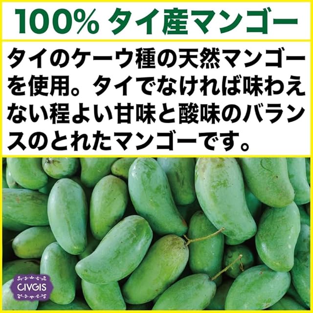【ケーウ種の天然マンゴー100%】タイ産のケーウ種を使用しています。ケーウ種はタイの固有種のマンゴーで、外皮は鮮やかなグリーンで果肉は比較的色が薄くて黄色から薄いオレンジ色のものが多くなります。