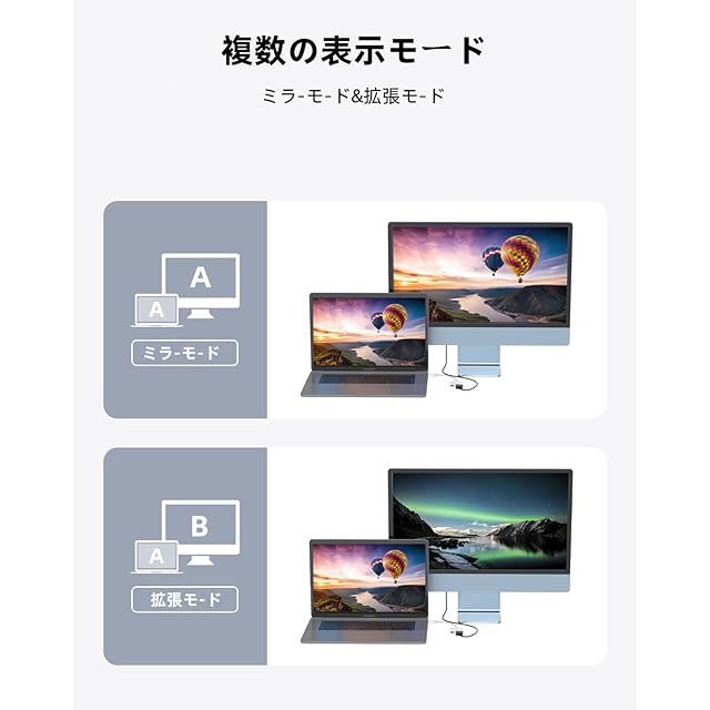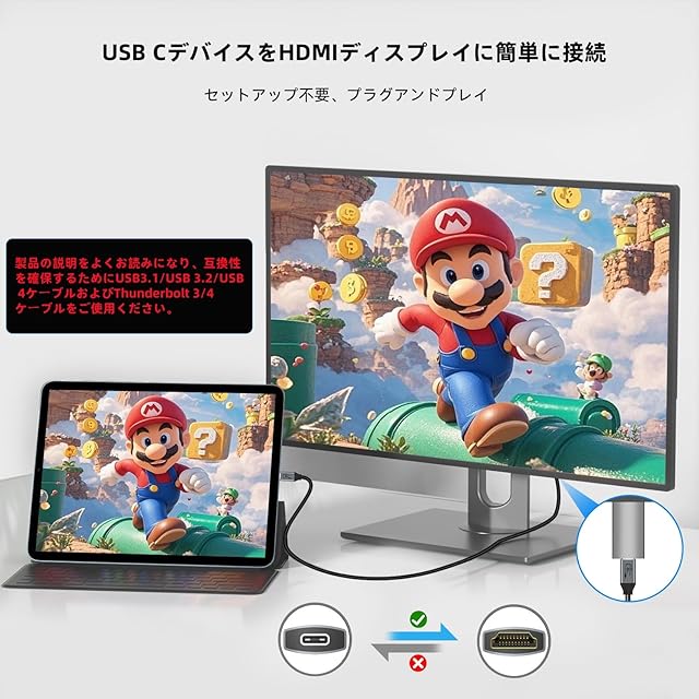【4K@60Hz高解像度】USB Cメス-HDMIオス変換アダプタは最大4K@60Hzの解像度をサポートし、HD解像度の画像をUSB-CデバイスからHDTV、モニターまたはプロジェクターに伝送し、ちらつきのないより安定したスムーズなパフォーマンスを提供します。1080P@ 144 Hz/60 Hz と下位互換性があり、低いリフレッシュ レートによる視覚疲労を防ぎます。拡大/ミラーリング可能な大画面で、鮮明な視覚体験を実現します。注:ご使用のUSB-CホストがDP Altモードに対応していることをご確認ください。