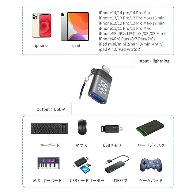 【OTG機能対応 幅広い互換性】 USB-A端子:キーボード、マウス、MIDIキーボード、USBメモリ、ハードディスク、USBカードリーダー、USBハブ、ゲームパッドなどに対応します。 light-ning端子:light-ning端子デバイス