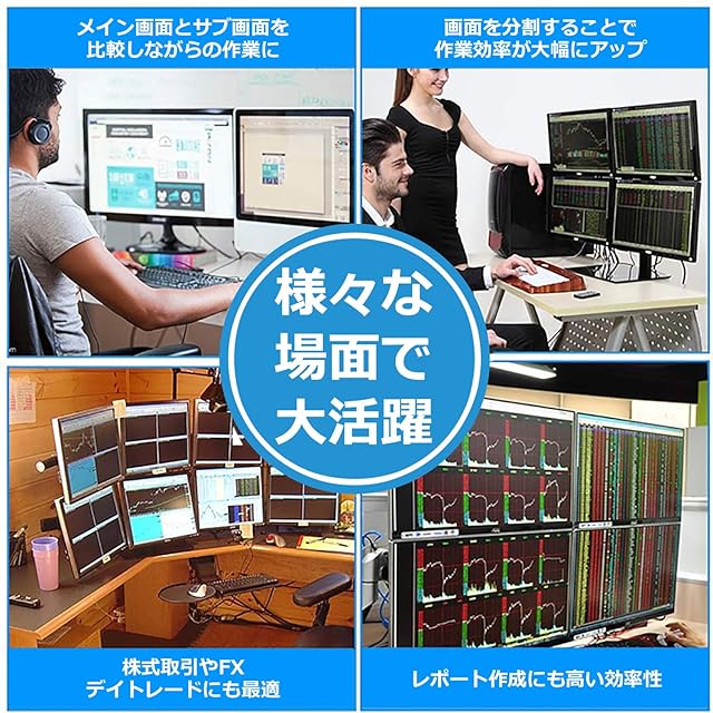 【作業効率アップの2モード】本製品を接続することでPCを2画面ディスプレイに拡張でき、作業効率をアップさせることも可能です。モード切替する際は【Windowsキー + P】を押してください。拡張モード:複数台のディスプレイを1つの大画面として表示します。ディスプレイ間は、ウィンドウもマウスポインタも自由に行き来でき、複数アプリケーションを大きく表示します。異なるファイル間のコピー&ペーストも快適に。ミラーモード:PCと同じ画面をプロジェクターなどの大画面に出力することができます。