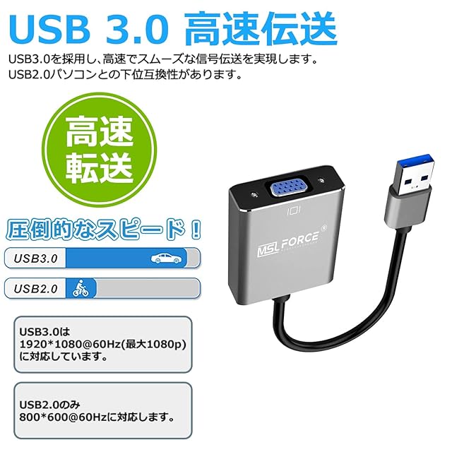 【1080フルHD】USB3.0 to VGA変換アダプターは、高帯域幅(5Gbps)の超高速USB 3.0インターフェースを活用し、HDTVまたはモニターに最大1920x1080の高解像度でグラフィック画像を提供します。