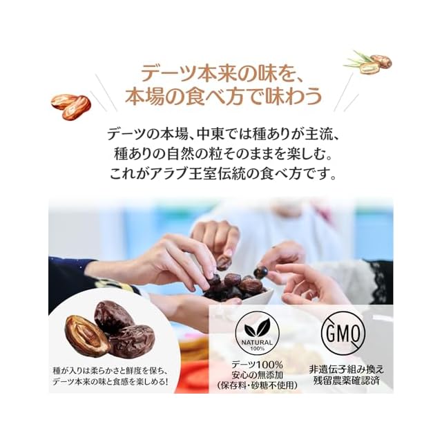【本来のデーツの味を楽しむ】デーツクラウンのデーツは、種入りです。種抜きは実をカットするため少し硬い食感ですが、デーツクラウンは種入りのためデーツ本来の柔らかさを味わうことができます。本場のデーツを本場の食べ方で、それがデーツクラウンのこだわりです。無添加、砂糖不使用、オイル不使用、非遺伝子組換え、残留農薬検査済(日本)のデーツです。