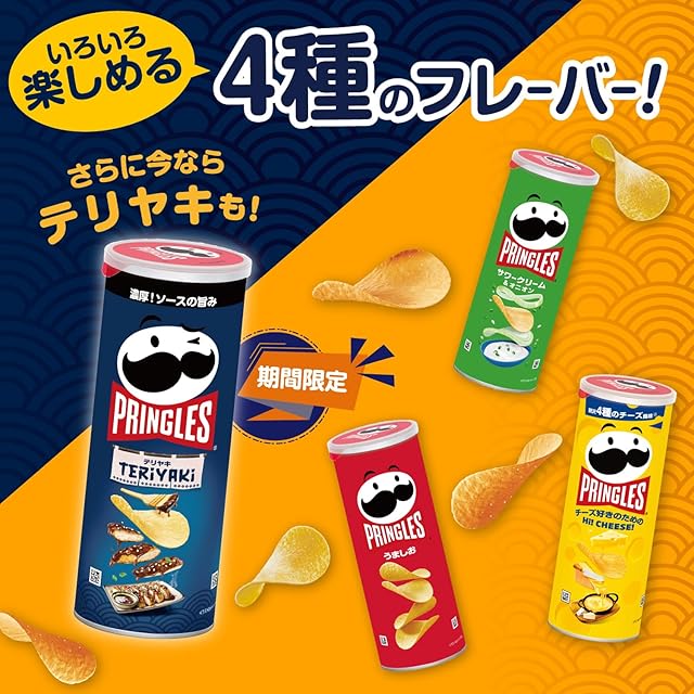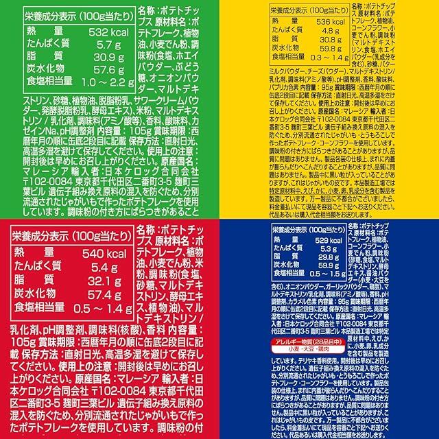 【サワークリーム&オニオン】100g当たり:熱量・・・532kcal、たんぱく質・・・5.7g、脂質・・・30.9g、炭水化物・・・57.6g、食塩相当量・・・1.0~2.2g【うましお】100g当たり:熱量・・・540kcal、たんぱく質・・・5.4g、脂質・・・32.1g、炭水化物・・・57.4g、食塩相当量・・・0.5~1.4g【Hi!CHEESE!】100g当たり:熱量・・・536kcal、たんぱく質・・・4.8g、脂質・・・30.8g、炭水化物・・・59.8g、食塩相当量・・・0.3~1.4【テリヤキ】100g当たり:熱量・・・529kcal、たんぱく質・・・5.3g、脂質・・・29.8g、炭水化物・・・59.9g、食塩相当量・・・0.5~1.5g
