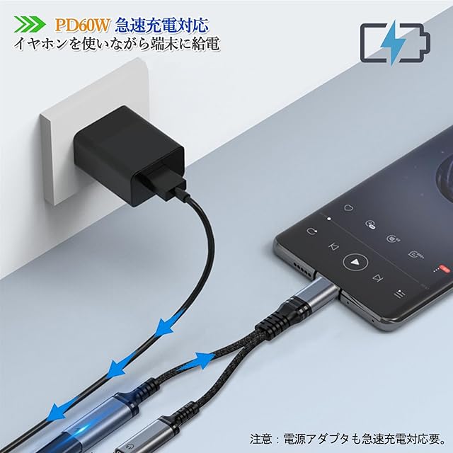 ♫【PD60W高速充電・無発熱で安全】イヤホン タイプc 二股 変換アダプタは音声出力の同時に、端末に充電することもできます。真のPD60W急速充電に対応しております。上質なチップや改善された構造を採用したことで、発熱が一切なくて安全に充電できます。その他、マイクやワイヤーコントロール機能のある有線イヤホンから、音楽再生/一時停止/前へ/次へ/電話応答/電話拒否/音量調節も難なくスムーズに操作可能です。
