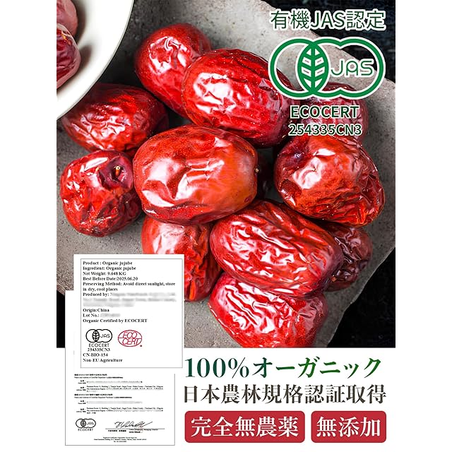 ✅1【日本JAS認証取得済み】: 当社の有機なつめは、厳格な基準を満たす高品質な製品であることを証明する日本の有機JAS認証を取得しています。これは、製品が有機農法に基づき生産され、化学肥料や合成農薬を使用せずに栽培されています。