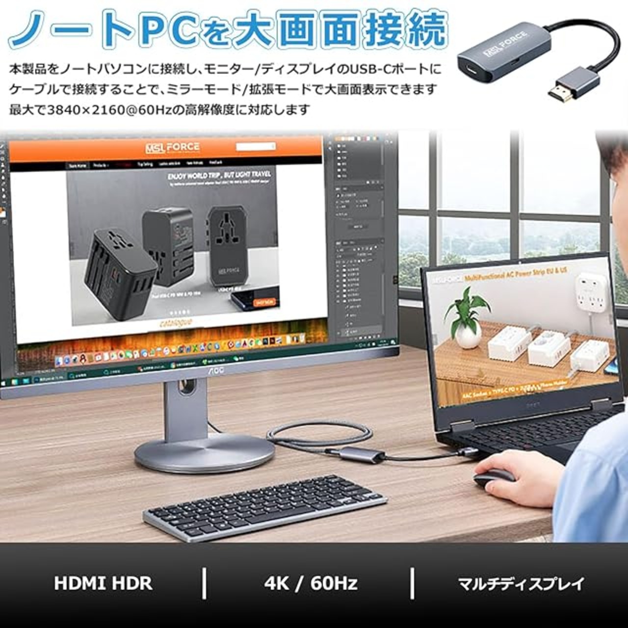【高画質&マイクロUSBポート】MSL FORCE HDMI to USBC Type-C 変換アダプタはHDMI2.0信号をUSB-Cビデオ信号に変換し、HDTVまたはモニターに最大3840×2160の解像度で高解像度のグラフィック画像を提供致します。また、本製品にはマイクロUSBポートが付いており、5V1Aの充電やデーター転送、両方対応可能な故、安定した電源を保証し、画面のちらつきを防いてくれます。※モニターがUSB-C経由でDisplayPort代替モードに対応できるかどうかを確認してください。※マイクロUSBケーブルはご自身でご用意するよう宜しくお願い致します。