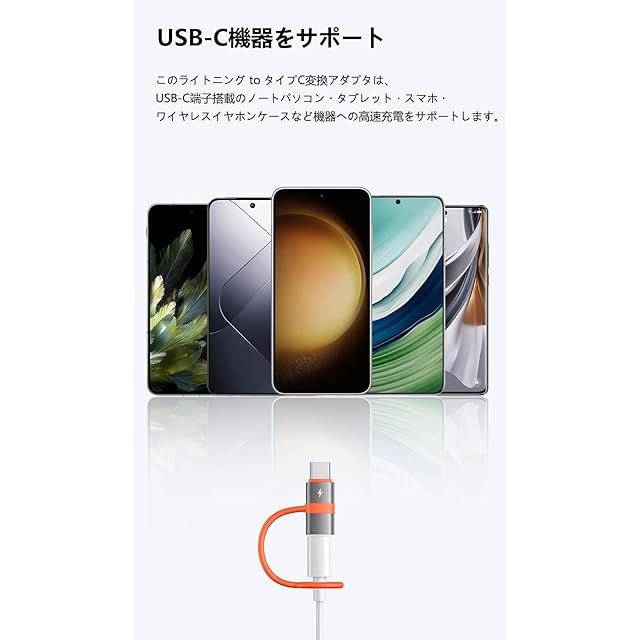 【幅広い互換性】:このライトニング to タイプC変換アダプタは、USB-C端子搭載のノートパソコン・タブレット・スマホ・ワイヤレスイヤホンケースなど機器への高速充電をサポートします。MacBookシリーズ、iPad Pro/Air、iPhone 16/16 Plus/16 Pro/16 Pro Max、iPhone 15シリーズ・Galaxy・Xperia・Pixel・AndroidなどUSB-C機器を対応します。【高品質な素材】:アルミ合金素材を採用して、高速に放熱可能ですし、性能が安定しています。精密なコネクタにより、スムーズに抜き差すことが可能です。インターフェースは平らで、ぴったりとフィットし、緩みません。【親切な設計、紛失防止】:シリコンザイル設計は、ケーブルに直接被せることができます。Type-C端子を搭載した機器を接続して充電でき、紛失にくいです。