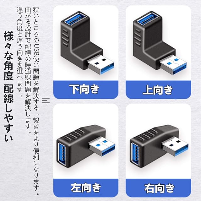 【角度変換/方向変換に】異な向きの4個セットです。角度変換、方向変換,上または下に曲がる。USBメモリなどの方向を変えられるため、省スペース可に役立ちます。方向を90度変え、狭い場所でも簡単に接続できます。
