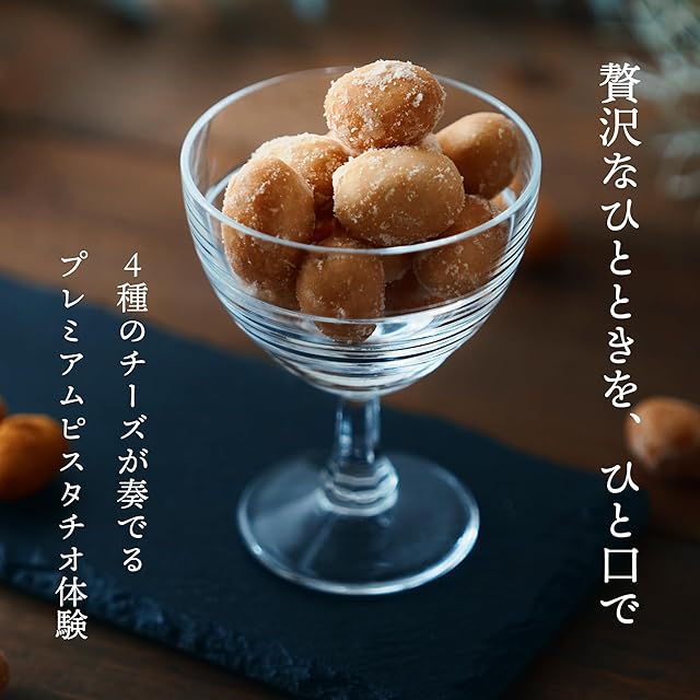【濃厚な4種のチーズを纏ったピスタチオ】「酪農王国」デンマーク産の4種類の高級チーズ(カマンベール、ゴーダ、チェダー、モッツァレラ)を絶妙にブレンド。チーズ好きにはたまらない、濃厚でコクのある風味が、ピスタチオの自然な甘みとマッチし、ワンランク上のおつまみとして楽しめます。レストランやホテルのBARで味わうような上質な時間を、ご自宅で手軽に。