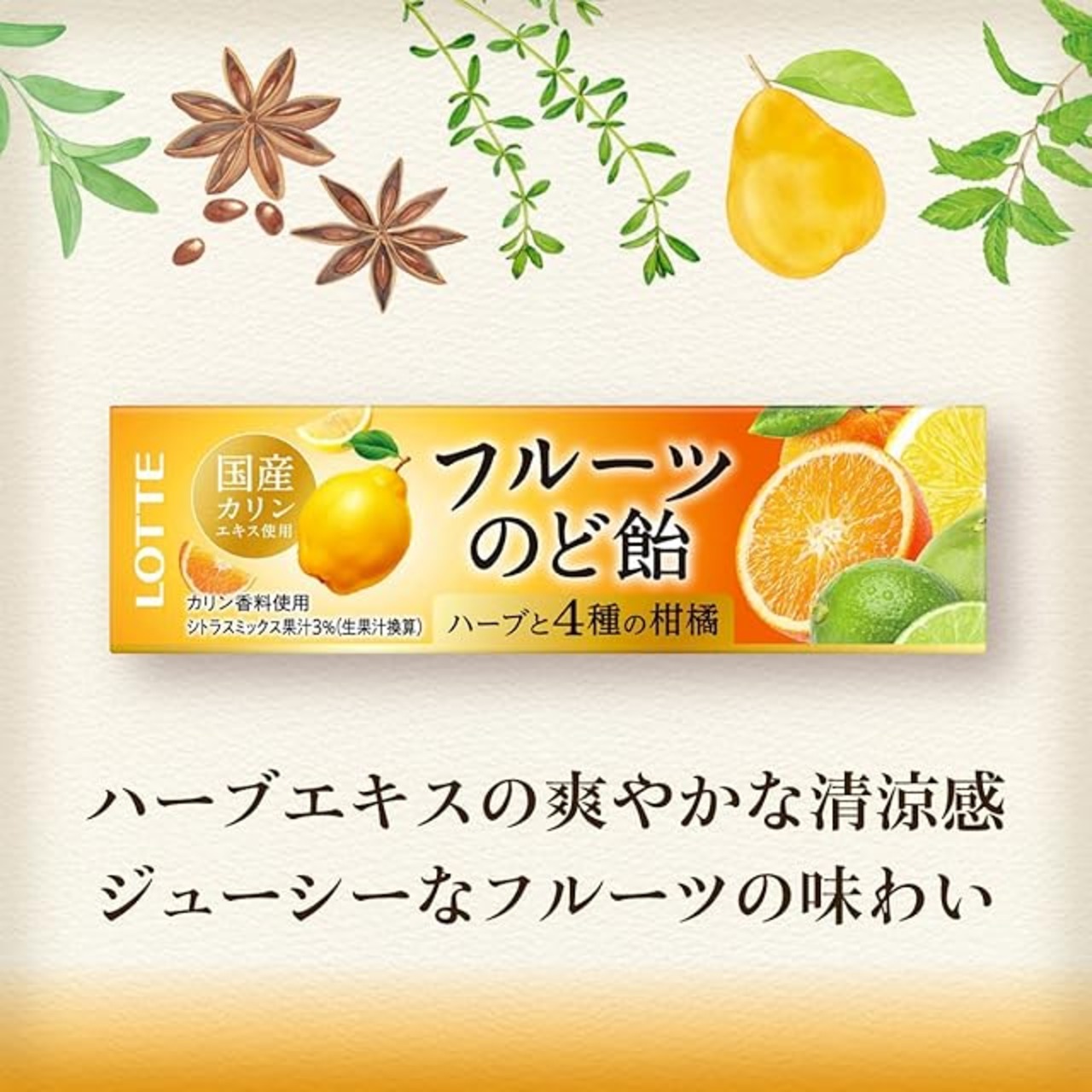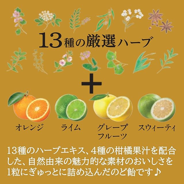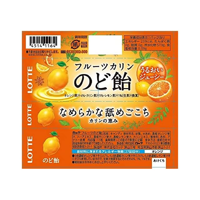原材料:砂糖、水あめ、ハーブエキス、濃縮オレンジ果汁、濃縮カリン果汁、カリンエキス、酸味料、香料、ビタミンC、アナトー色素、調味料(アミノ酸)、(原材料の一部に大豆を含む)