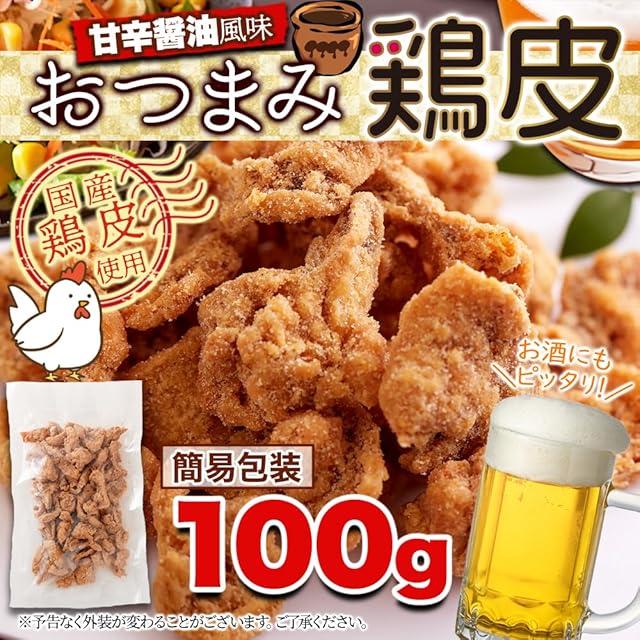 ■商品名:おつまみ鶏皮 甘辛醤油風味 ■名称:鶏皮のからあげ ■原材料名:鶏皮(国産)、米粉、植物油脂、蒲焼のたれ風シーズニング(小麦・さば・大豆を含む)、食塩/調味料(アミノ酸等)、加工デンプン、リン酸三カルシウム、甘味料(アスパルテーム・L-フェニルアラニン化合物、アセスルファムカリウム)、香料 ■内容量:100g ■賞味期限:製造日より常温180日 ■保存方法:直射日光、高温多湿を避けて保存してください。本品原材料に含まれているアレルギー物質(28品目中) 小麦 さば 大豆 鶏肉 ≪お召し上がり方≫そのままお召し上がりください。 ※鶏毛は原料由来のものであり、品質には問題ございません。 ※封入しております脱酸素剤は食べられません。 ※開封後はお早めにお召し上がりください。※本品は特定原材料中、えび、かに、くるみ、そば、卵、乳成分、落花生を使用した設備で製造しています。