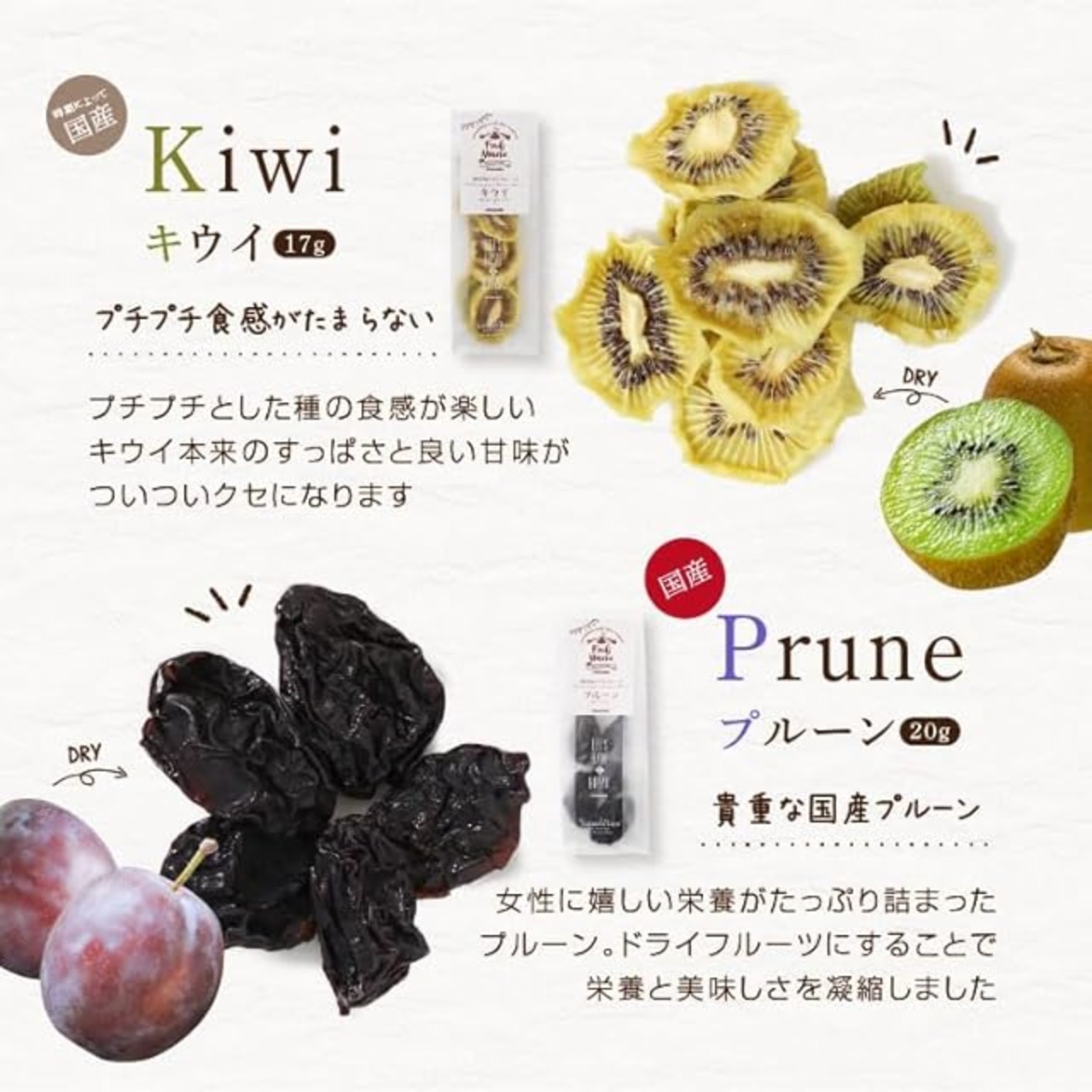 【ボディメイクにも】ドライフルーツは水分がない分 よく噛む必要があり、食物繊維がお腹に溜まるので満腹感が得やすく、さらにカリウムが含まれるものも多く、体重の減量にも有効です。フルーツをそのままたくさん食べるよりも、効率よく気軽に続けられます。