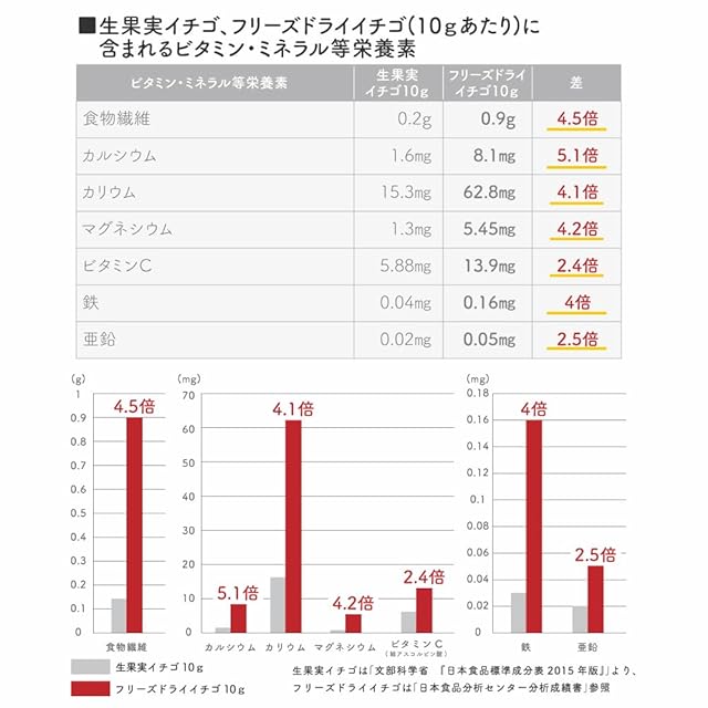 【美味しさと栄養がぎゅっと詰まったいちご】イチゴの果肉をそのままフリーズドライにしました。 果肉のビタミン・ミネラル等の栄養素が凝縮され、 生の状態と同じ量で比較すると食物繊維やカリウム、鉄、ビタミンCなどの栄養素が圧倒的に多くなります。