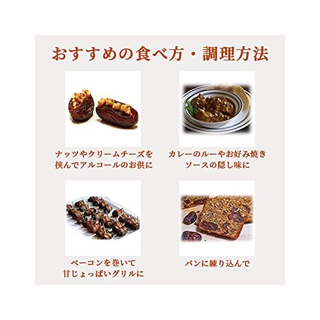 ※ そのままお召し上がり頂けますが、食べる前に軽く水洗いして頂くとより衛生的です。※デーツに付きものの虫について 虫についてはなるべく防止できるように努めておりますが、自然の農産物の性質上、虫を100%防止する事はできませんのでご了承願います。※写真はイメージです。 業務用仕入れにもどうぞ。